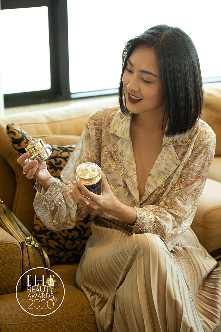 Người mẫu Mid Nguyễn tạo dáng bên quà lưu niệm của ELLE Beauty Awards 2020. Ảnh: DaiNgo Studio.